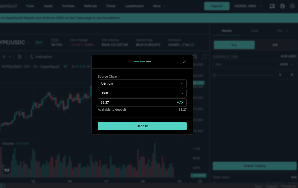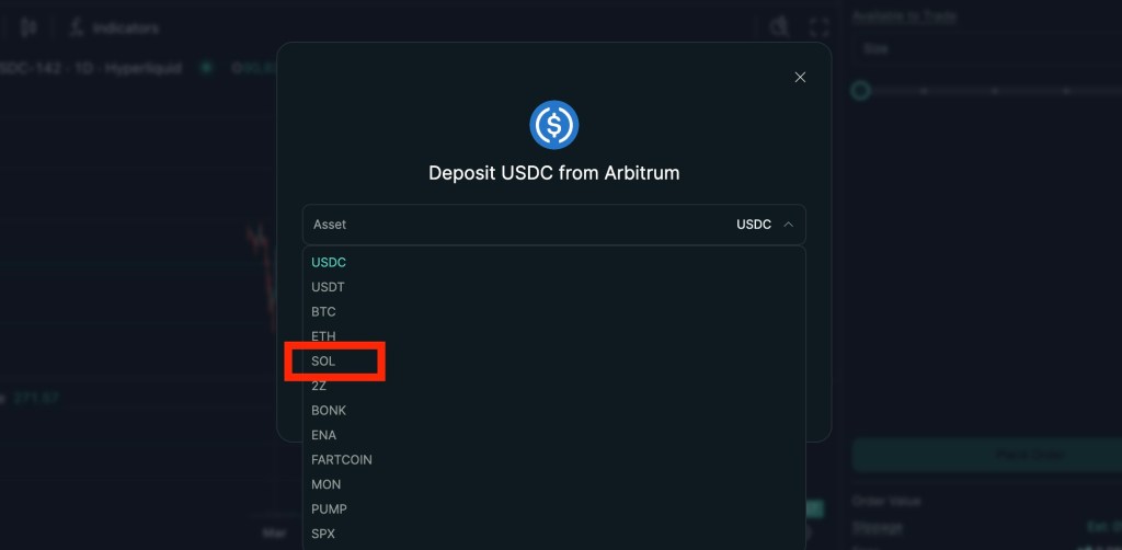 하이퍼리퀴드는 초기에 Arbitrum 네트워크를 이용한 USDC 입금만 지원했으며 이제는 다른 자산도 입금 가능하지만 아비트럼 USDC 입금을 원할 경우 이 방법을 이용할 수 있다. 솔라나 코인 입금 방법도 아래에서 설명한다.