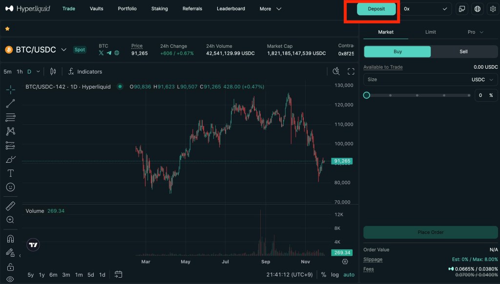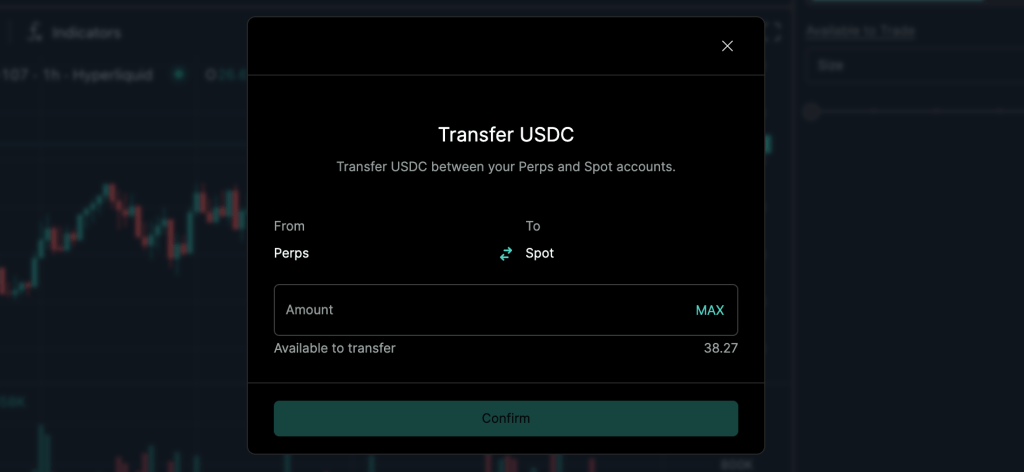 7. 입금한 USDC는 현물(spot account) 지갑이 아니라 선물 지갑(perps account)으로 들어간다.