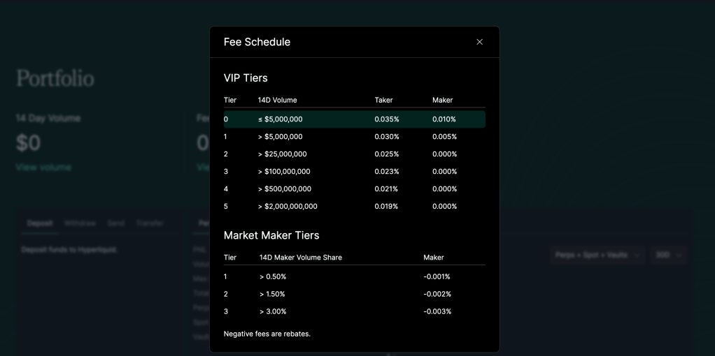 그렇다면 바이낸스, 코인베이스 등 기존 주요 CEX와 어떻게 다를까? 우선 거래 수수료가 저렴하다. 앞서 언급했듯이 하이퍼리퀴드는 거래할 때 가스비가 발생하지 않으며 거래 수수료는 아래 테이블과 같다. 이 링크를 이용하면 모든 거래에 대한 수수료 할인까지 받을 수 있다.