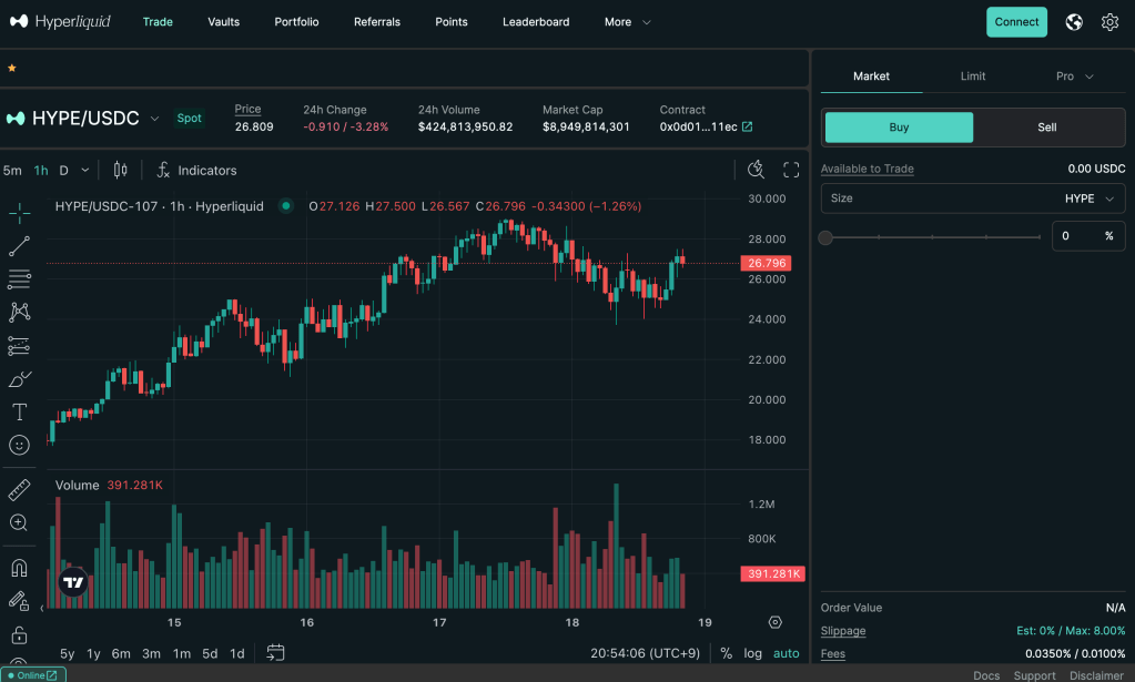 하지만 더 큰 장점은 바로 DEX이기 때문에 CEX에서 필요한 신원 인증 절차가 필요하지 않다는 점이다. 하이퍼리퀴드는 은행 계좌를 연결하거나 신분증을 들고 사진을 찍어 인증하고 전화번호를 인증하는 등의 절차 없이 간단하게 지갑 하나만 연결하면 거래를 시작할 수 있다.