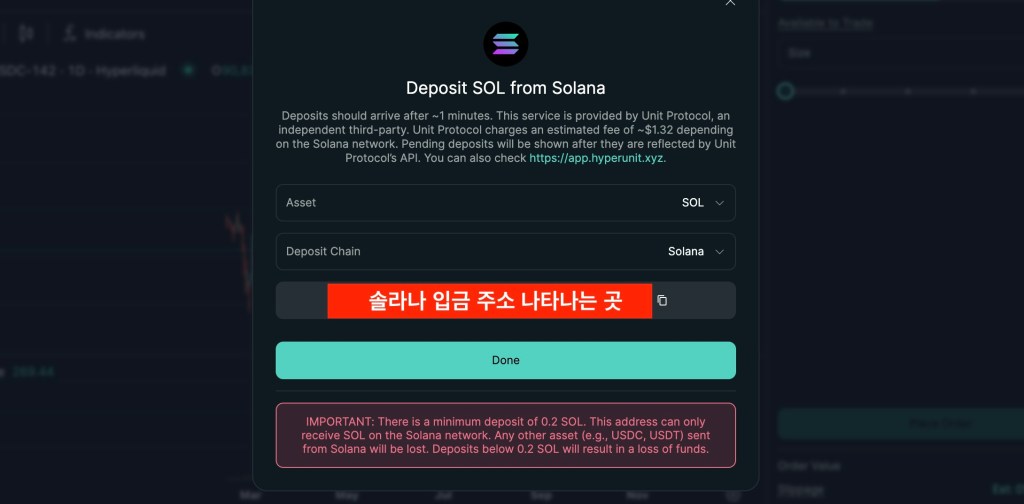 4. 솔라나를 선택하면 아래처럼 화면이 바뀐다. 이제 솔라나 네트워크 위 SOL을 입금할 수 있다. 화면에 나타난 솔라나 입금 주소를 옆에 있는 복사 버튼을 눌러 주소를 복사한 후 본인의 솔플레어, 팬텀 등 솔라나 지갑에서 송금 주소로 지정해 원하는 만큼 입금하면 된다. 단, 0.2 SOL 이상 입금해야 하며 그보다 적으면 하이퍼리퀴드가 삼켜버리니 유의할 필요가 있다. (확인해보니 정말 0.1 SOL은 입금되지 않는다)
