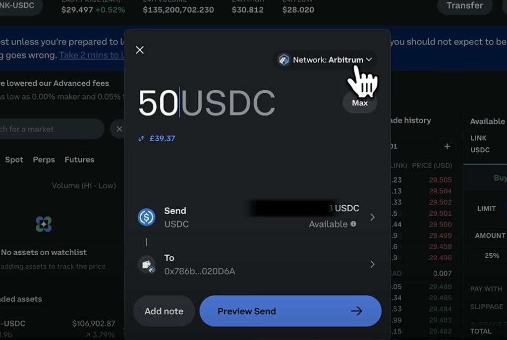- 이용하는 거래소에서 USDC 코인을 아비트럼 네트워크로 메타마스크 월렛으로 이체한다. (가스비로 이용할 아비트럼 ETH 있는 경우)